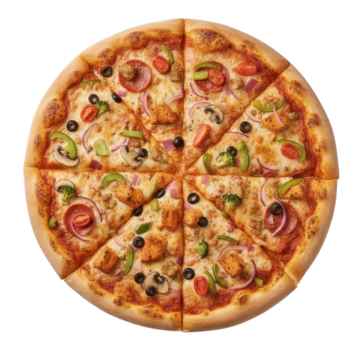 Our Vegetable Pizza is a garden of flavors. Loaded with fresh bell peppers, onions, tomatoes, olives, and melted mozzarella on a golden, crispy crust, it’s cheesy, colorful, and utterly satisfying.